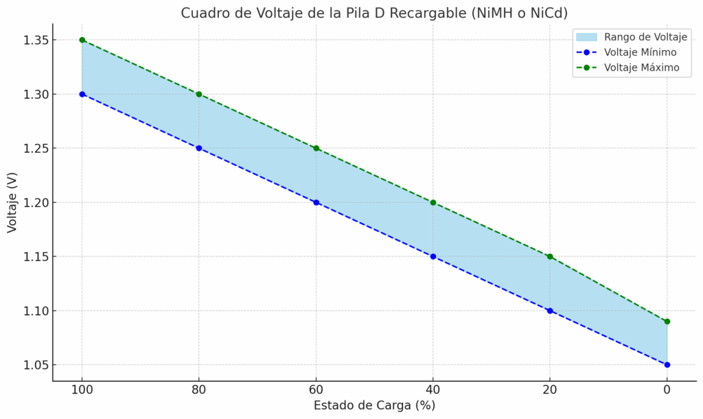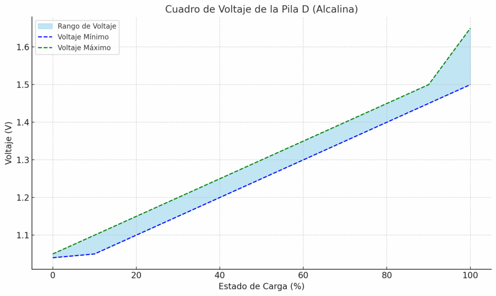 Cuadro de voltaje de las pilas alcalinas de tipo D